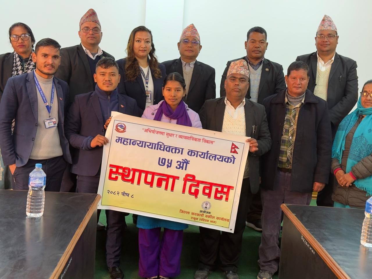 ८ पौष,२०८२- मिति २०८२ पौष ८ गते यस जिल्ला सरकारी वकील कार्यालय,रुकुम (पश्चिम भाग)को आयोजनामा यस कार्यालयका जिल्ला न्यायाधिवक्ता श्री हरिप्रसाद घिमिरेको अध्यक्षता तथा श्री रुकुम जिल्ला अदालतका माननीय जिल्ला न्यायाधिश श्री दिपेन्द्र थापामगरको प्रमुख आतिथ्यतामा बिबिध कार्यक्रम गरी महान्यायाधिवक्ता कार्यालयको ७५औ स्थापना दिवश मनाईयो।